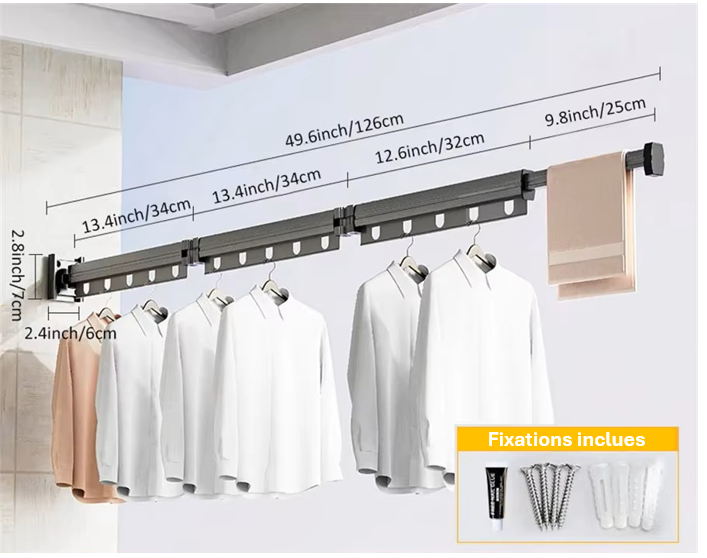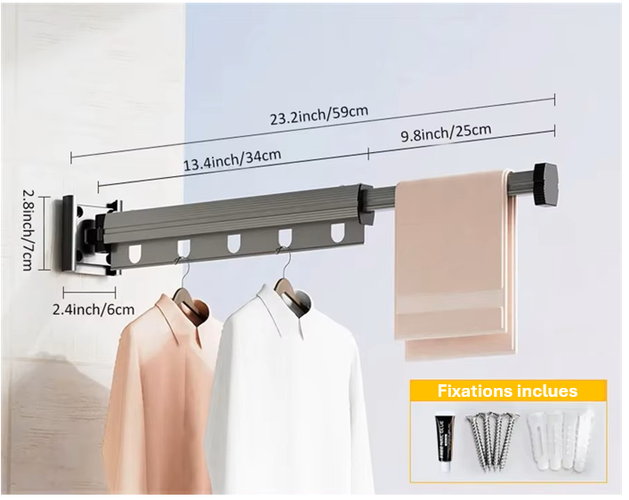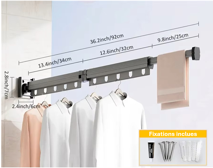 Grâce à son design pliable et mural, il s'intègre parfaitement dans les petits espaces tels que les balcons, salles de bain ou chambres, tout en restant discret une fois replié. Que ce soit dans un appartement, un hôtel ou une maison, il se fixe sans perçage grâce à un système adhésif puissant, ou avec des vis si vous préférez.